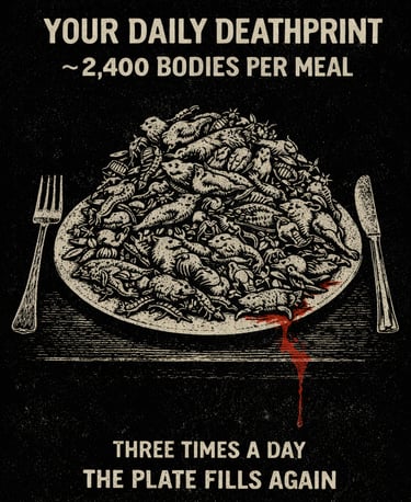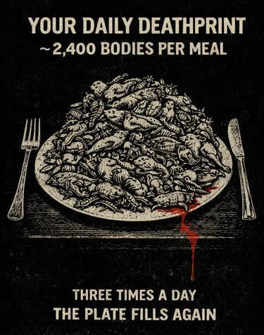 How many cows have a bolt driven through their skulls, how many chirping chicks are tossed into the meat grinder, how many field mice are mangled in the harvester blades, how many bees are splatted against your windscreen...I think you get the idea.