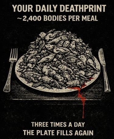 When these direct and indirect deaths are combined, the toll becomes staggering. If your personal deathprint were divided into three meals a day for the duration of your life, each plate would carry roughly 2,400 dead bodies — a hidden graveyard beneath the illusion of an ordinary meal.