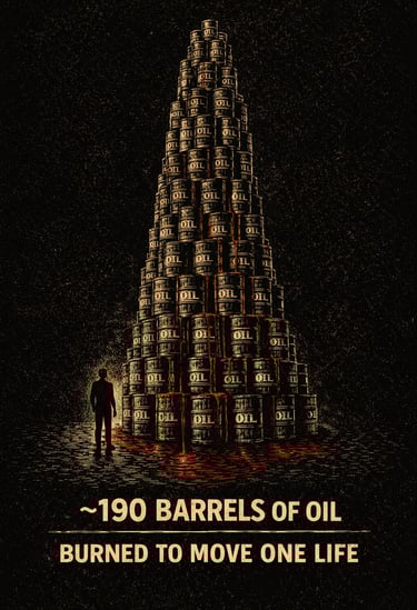 Think back to the last time you drove somewhere without thinking—just rolling forward while the world slid past your windows—and now imagine that as a lifetime habit: ~200,000 miles on the road, thousands of hours spent moving fast enough that anything in your path becomes “nothing” before your brain can register it; and to do it you burn ~30,000 litres of petrol/diesel; about ~190 barrels of oil pulled from the ground, transported, refined, shipped, stored, and pumped, a supply chain that leaks even on “normal” days through spills, discharges, and chronic contamination, and occasionally turns whole shorelines into blackened death.